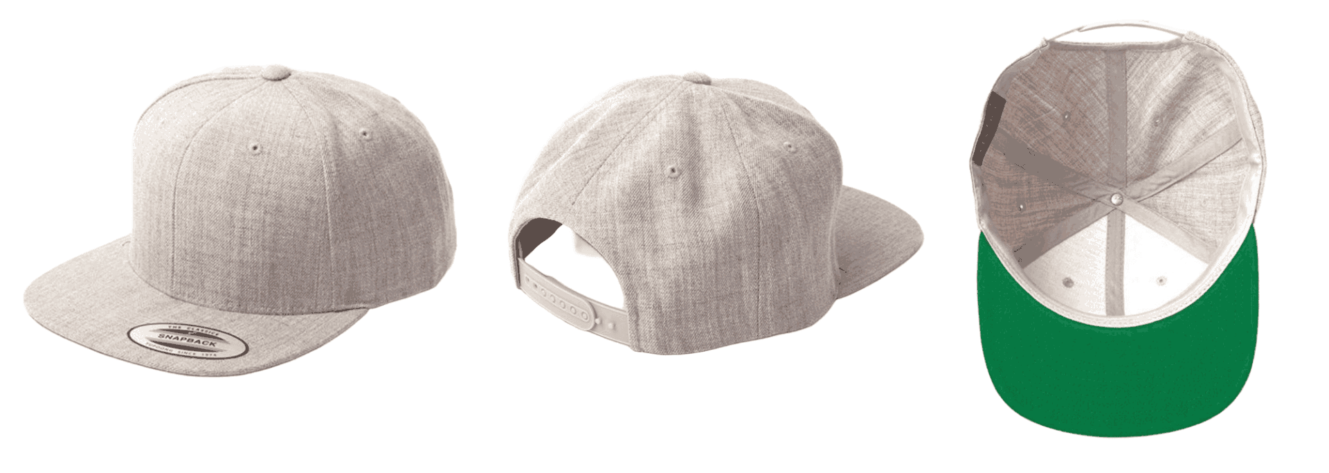 6パネルフラットバイザー、同色スナップバック、つば下は緑サテン