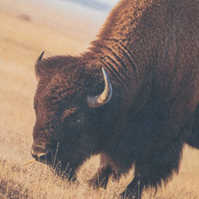 縫製箇所にかかる部分やシワになる箇所は、プリントが切れたり、ぼやけたりします。特に脇の下などシワができやすい部分です。写真にはないですが、首元のリブにひっぱられたシワや肩口の縫製部分もぼやけたり掠れたりしやすいです。下記画像をご参照ください。