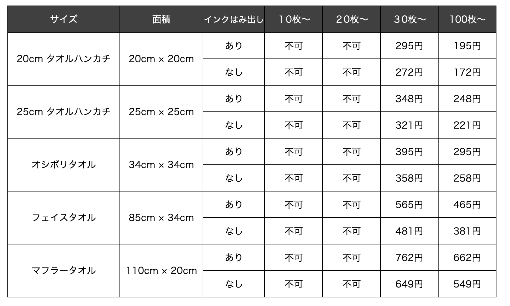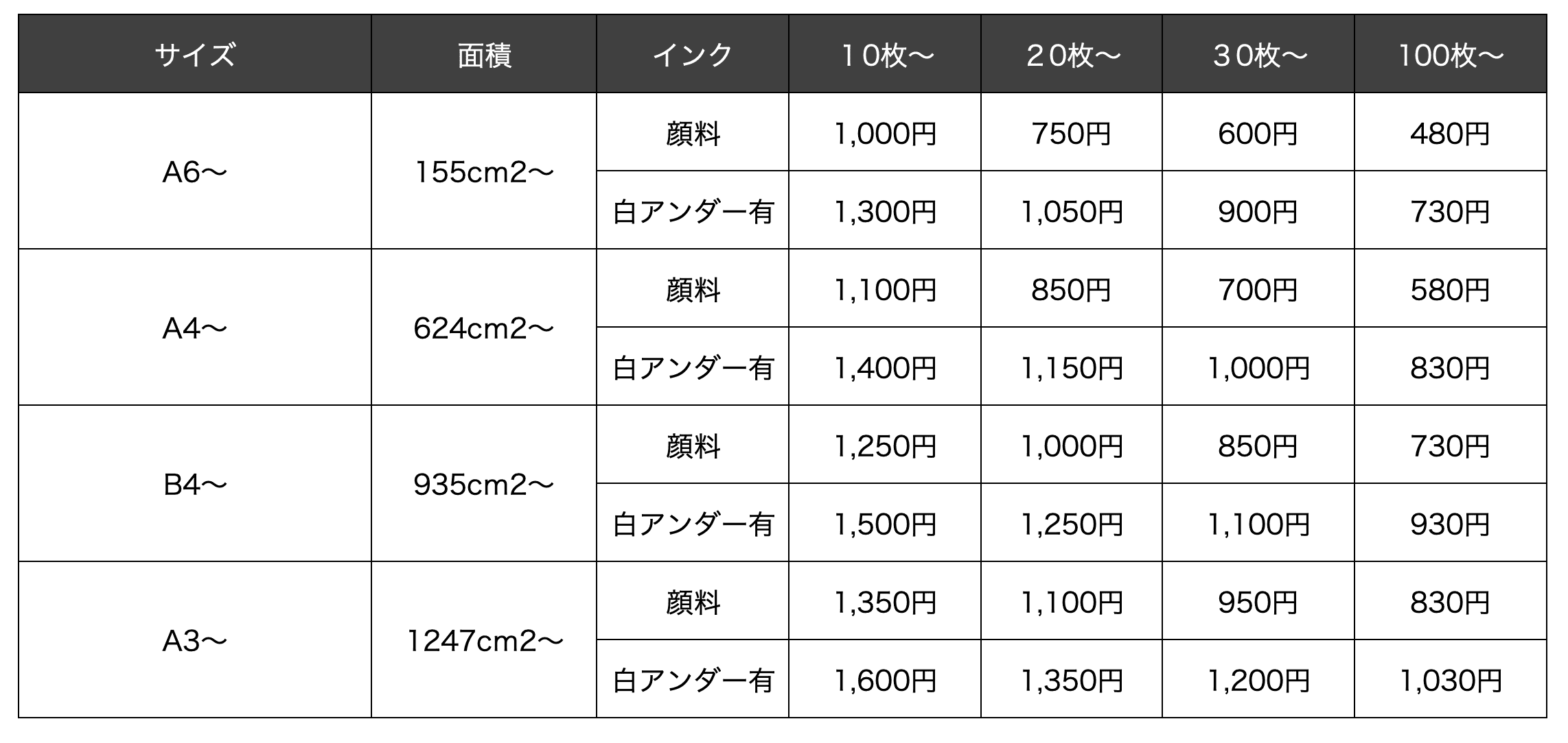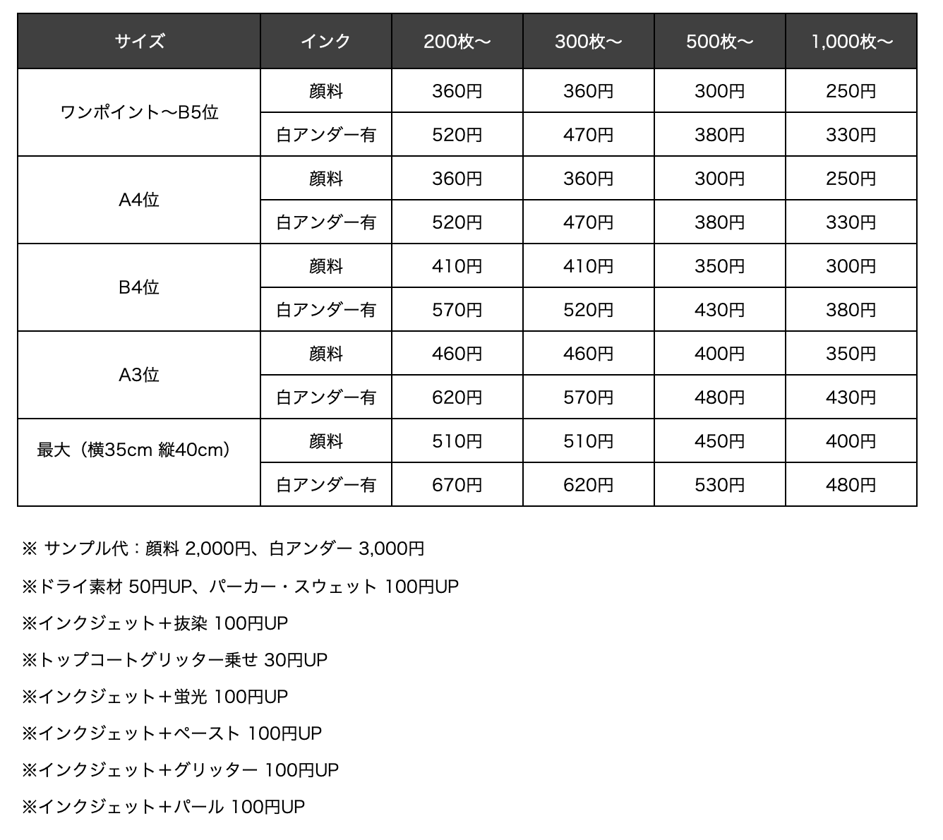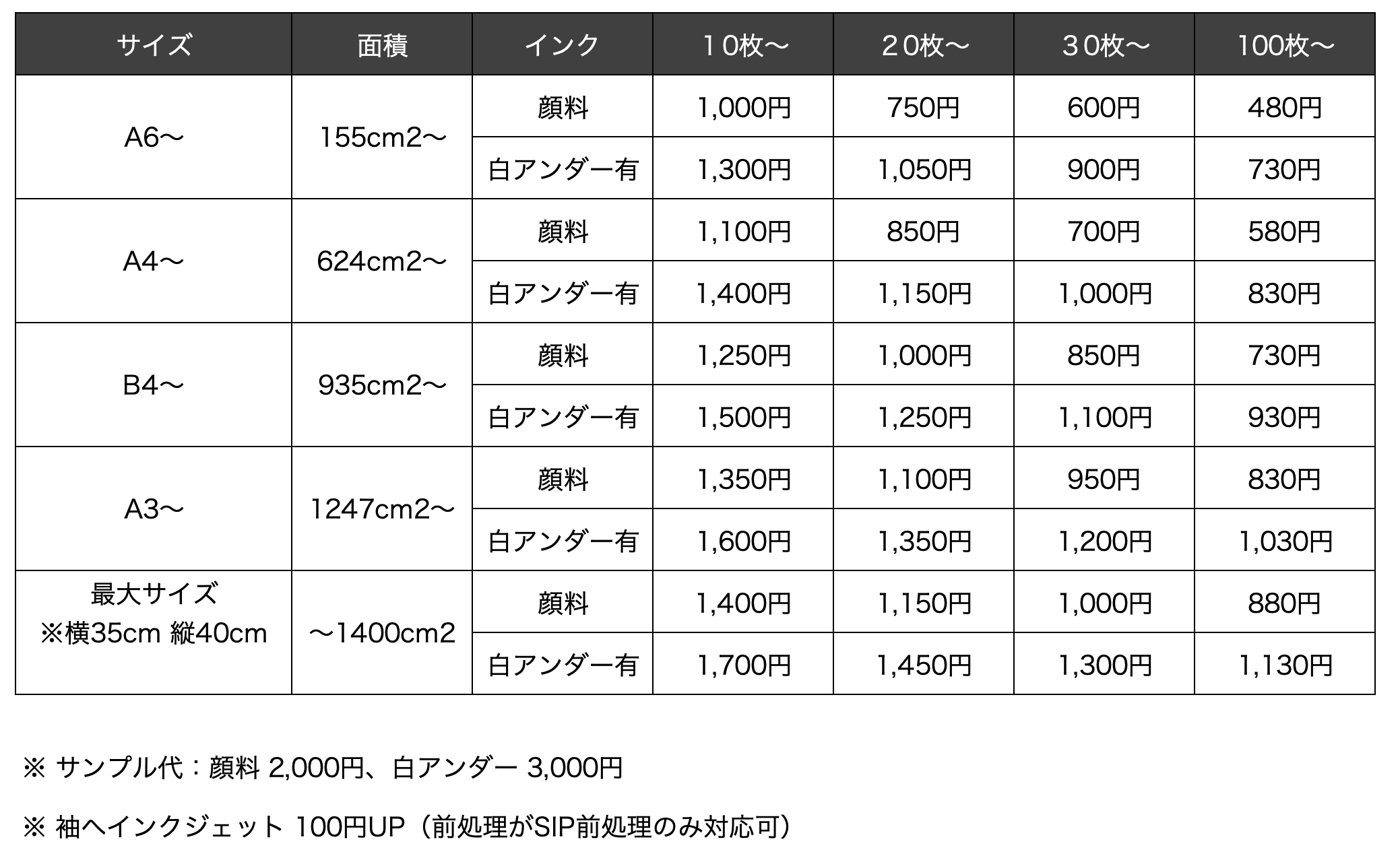 ※ 高速インクジェットに合わせてシルクプリントをする場合、1色追加ごとに50円UP(特殊インクの場合は別途見積もり)