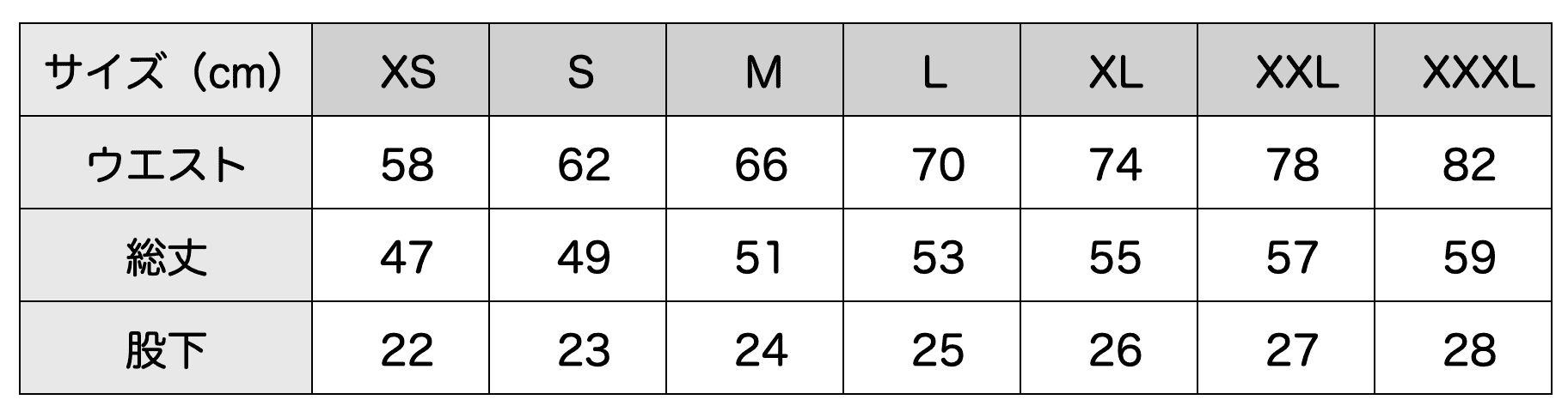 | XS | S | M | L | XL | XXL | XXXL | |