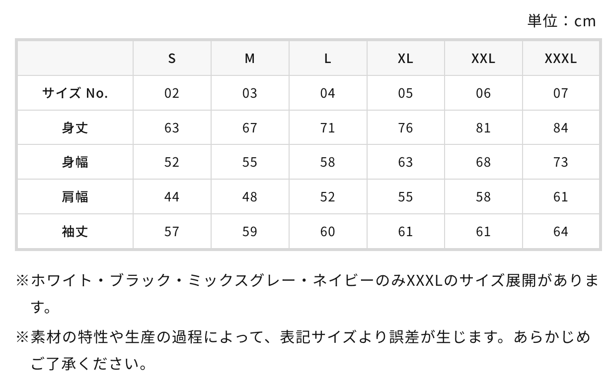 ※XXXLは、ホワイト・ブラック・ミックスグレー・ネイビーのみとなります。