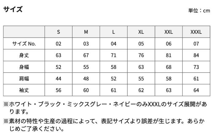 ※XXXLはホワイト・ブラック・ミックスグレー・ネイビーのみとなります。