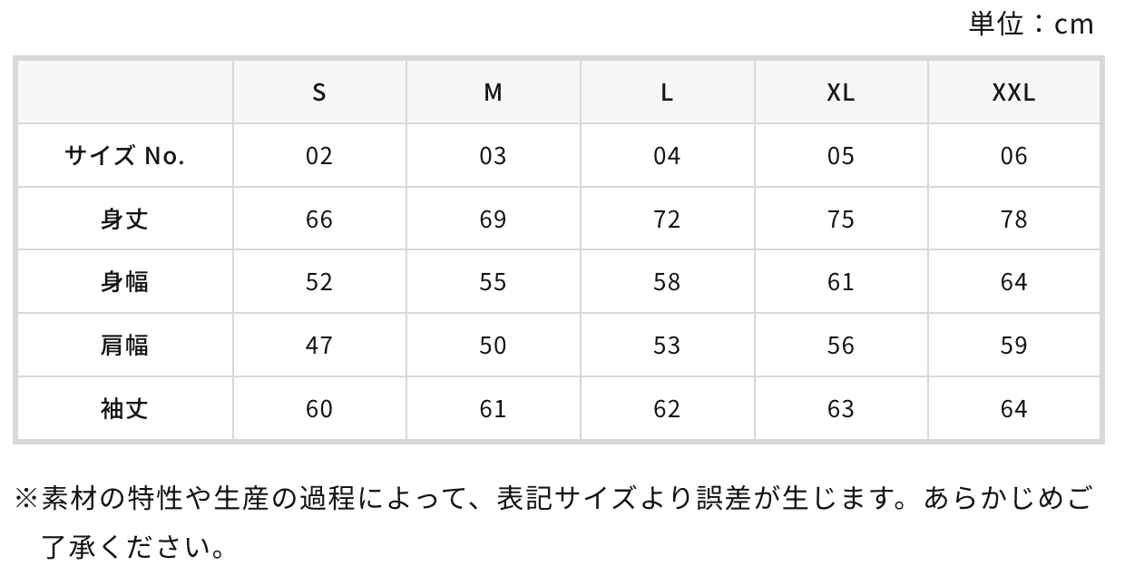 取得中… 在庫更新| S | M | L | XL | XXL | |
