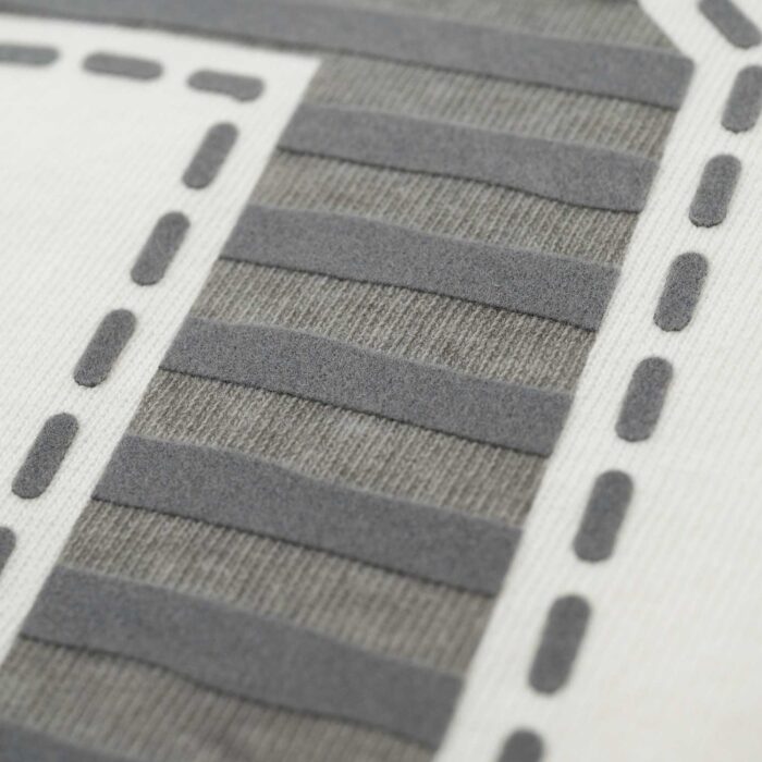 フロッキープリントとも組み合わせることが出来ます。生地と一体化する染み込みプリントをベースにすることで、フロッキーのふわふわとした立体感がこれ以上なく際立ちます。凹凸のギャップが生むこの立体感と、柔らかな風合いがおすすめです。